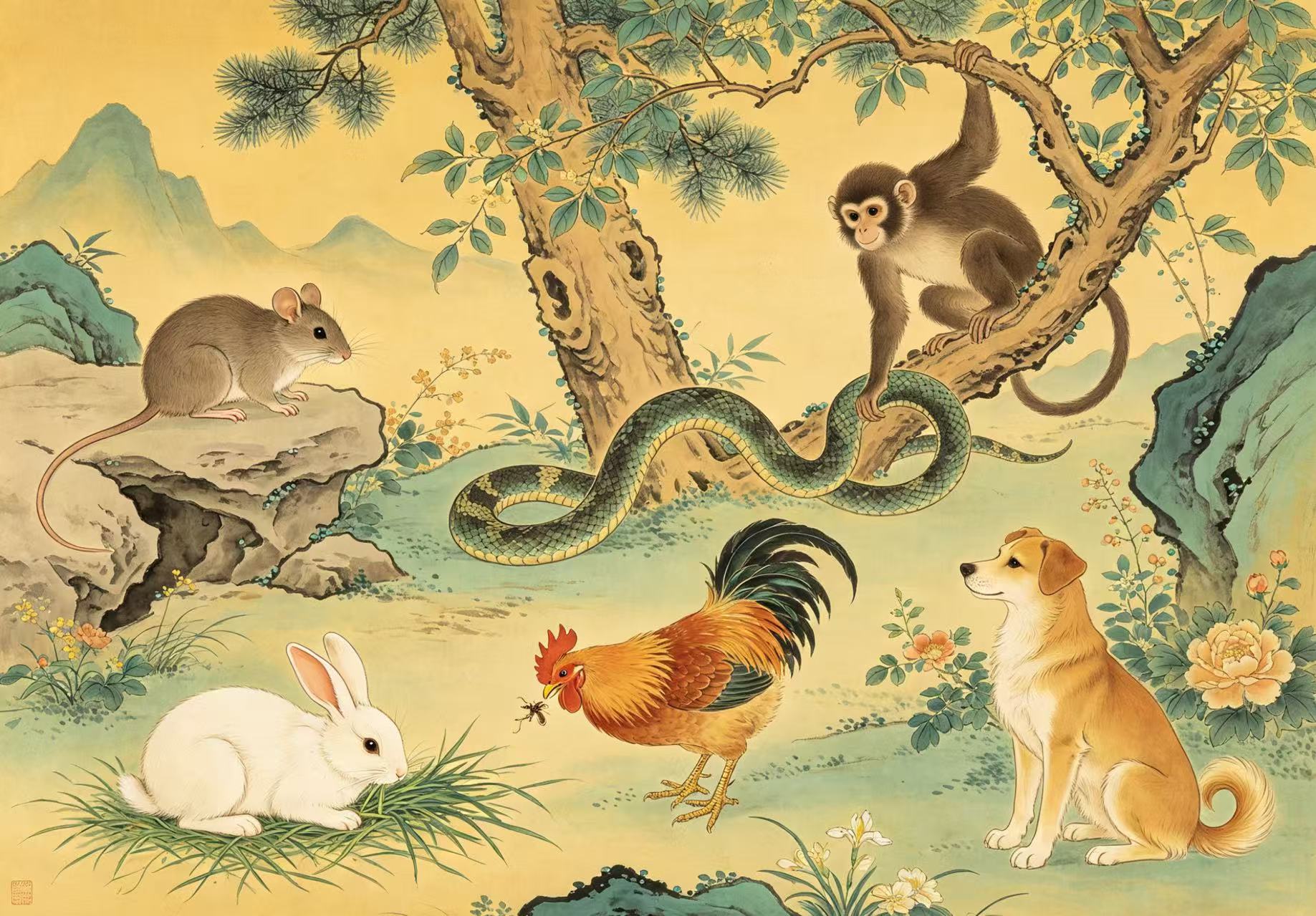 左肖:鼠牛龙蛇猴鸡 右肖:虎兔马羊狗猪 |